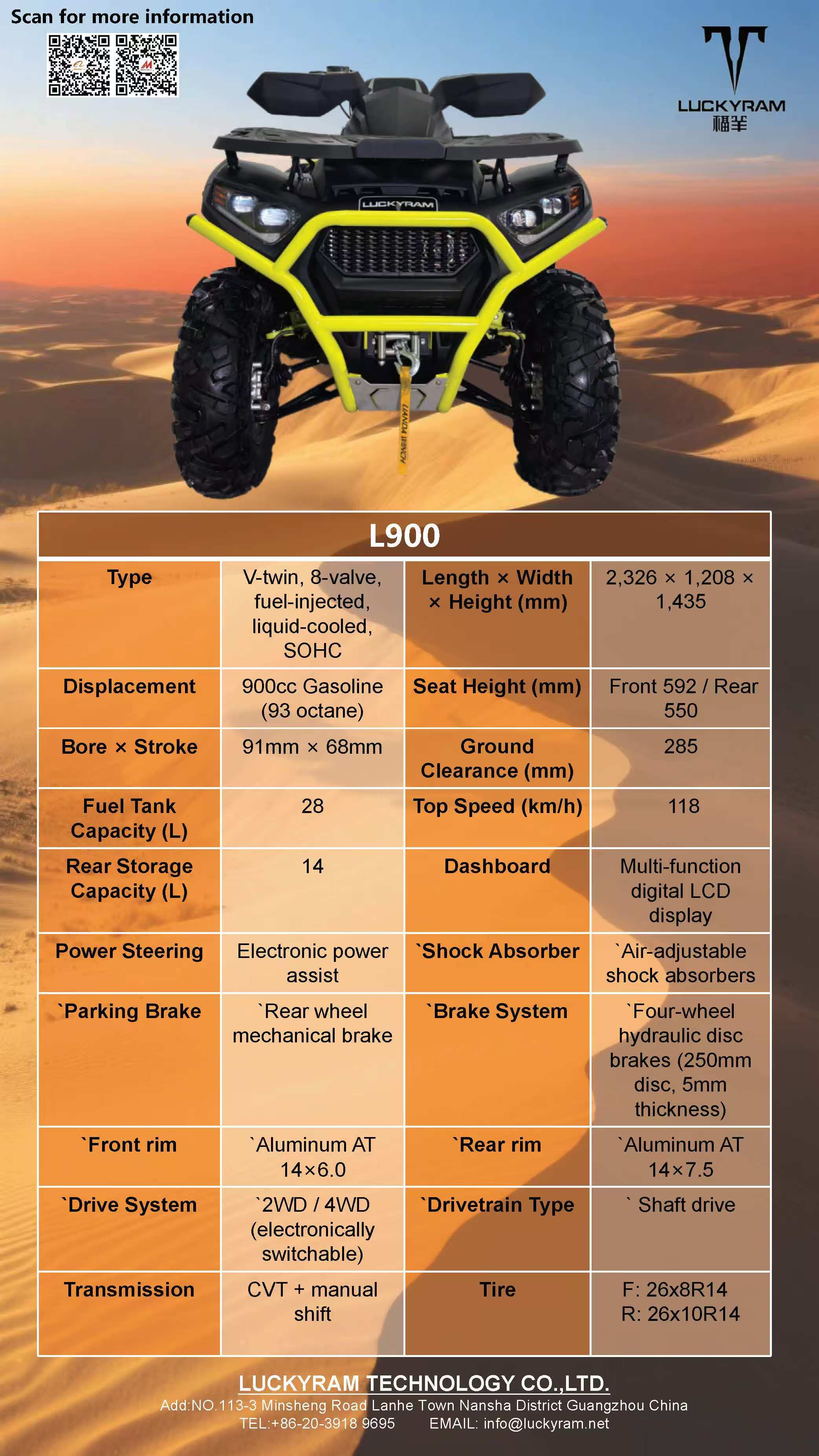 Výkonný motor-vybavený vysokovýkonným štvortaktným motorom s rozlohou 900 ccm, ktorý dodáva silné krútiace moment a zrýchlenie pre terénne dobrodružstvá. Bahno, piesok a skalnaté chodníky.High-kapacity Zaťaženie a ťahanie-navrhnuté so silnými stojanmi a odťahovacím závesom, schopné prepravovať ťažké bremená pre prácu alebo rekreáciu. kotúče diskov (predné a zadné) zaisťujú rýchle a bezpečné zastavenia aj pri vysokých rýchlostiach Výkon v odľahlom alebo zložitom teréne pre núdzové misie.