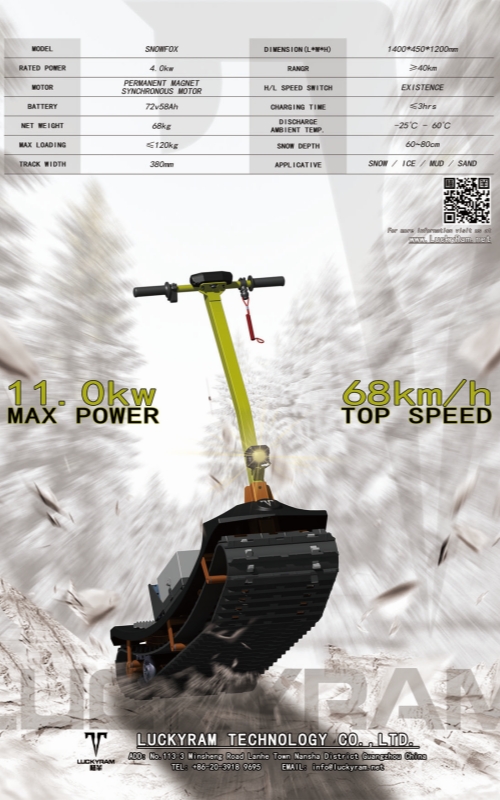 Tento snežný skúter je poháňaný vysokokvalitnými motormi 4 kW a vybavenými veľkorysými lítiovými batériami, je ideálny pre hlboký sneh. Jeho systém riadenia skateboardu zaisťuje príjemnú jazdu v snehu.